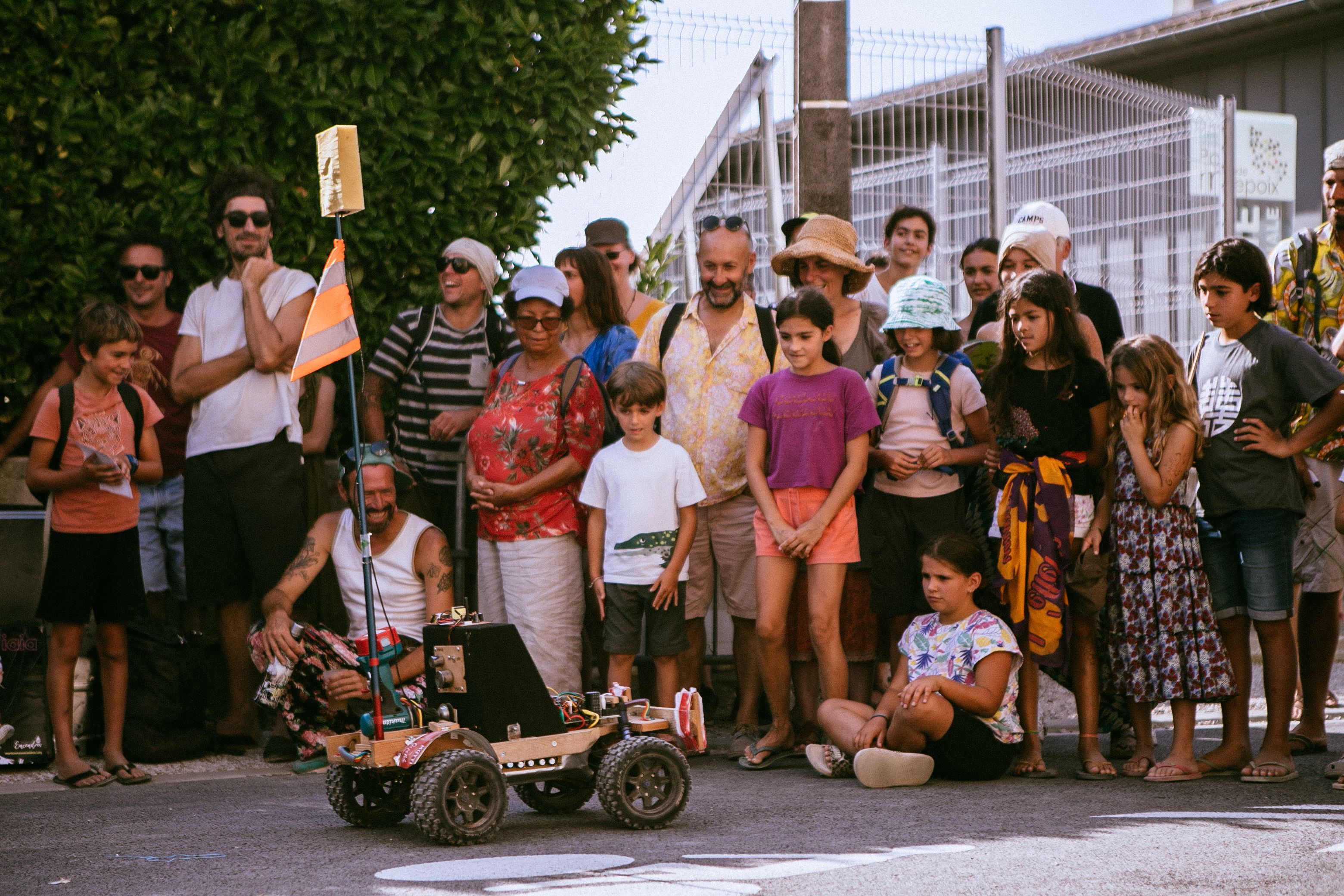 Un homme, se promène, ou mieux promène, en toute tranquillité, un peu comme avec un animal de compagnie, une petite voiture quelque peu particulière. Faite de bric et de broc, à la fois fragile et étonnamment résistante, elle embarque un condensé de basse technologie qui, oh surprise, lui donne non seulement une vie autonome, mais aussi… la parole ! C’est cela même : une voiture parlante, qui interagit avec son accompagnateur mais aussi avec le public et qui jouit d’une intelligence propre, un caractère, une personnalité.